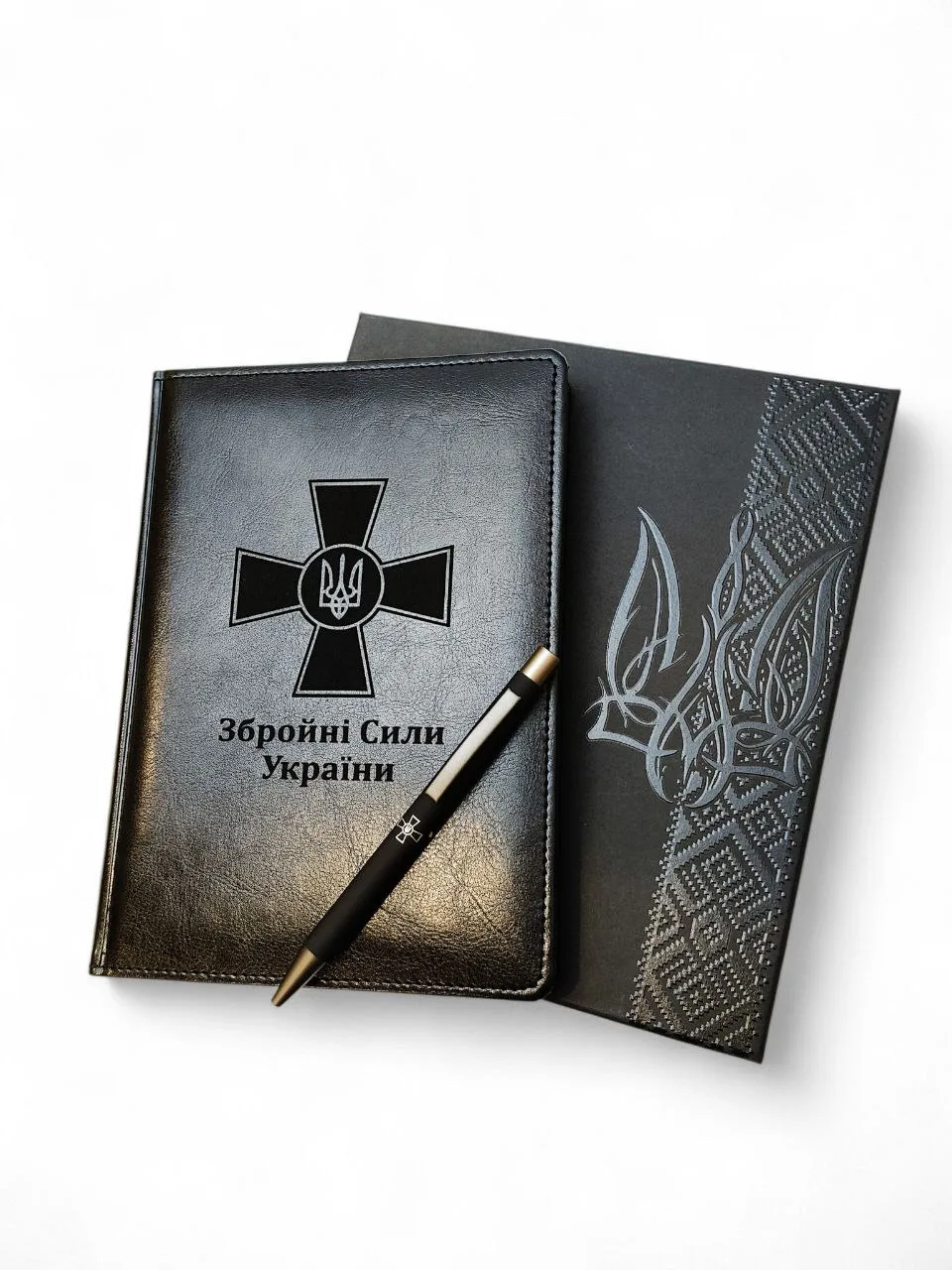 Комплект “Блокнот + ручка” для військового з гравіюванням “Збройні Сили України”,в коробці з орнаментом та рельєфним зображенням Тризуба, пакет подарунковий.