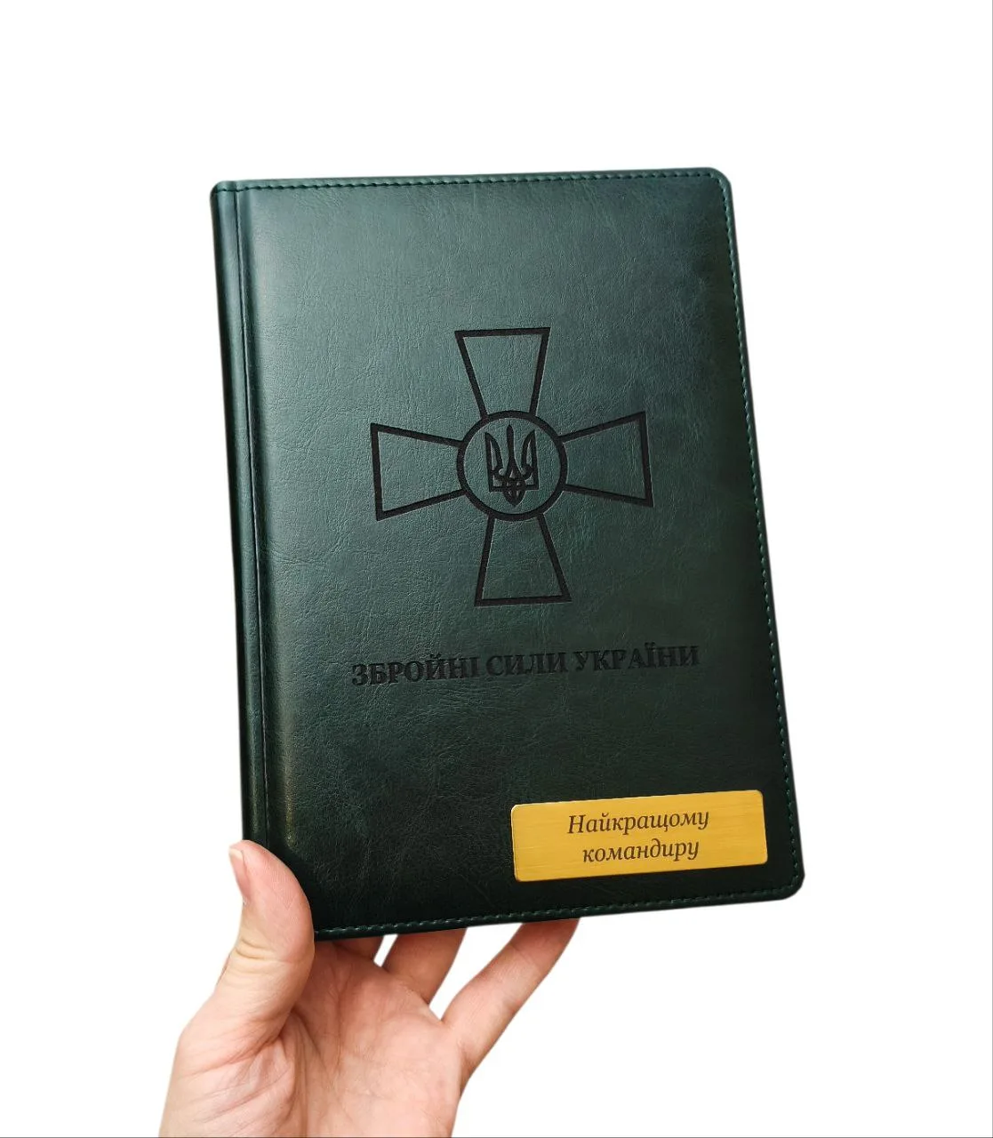 Глибокий зелений колір, якісна обкладинка та гравіювання з емблемою ЗСУ роблять його не просто канцелярією, а знаком поваги й визнання. Металева табличка з написом «Найкращому командиру» підкреслює індивідуальність подарунка та його особливе значення.