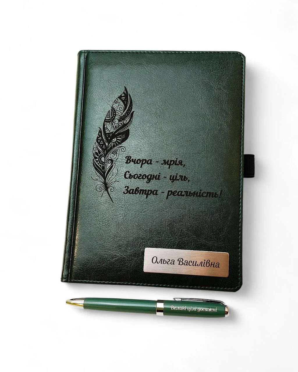 Стильний та натхненний набір, що поєднує в собі елегантність і зміст – щоденник із мотиваційним гравіюванням та іменною шильдою, а також металева преміальна ручка в зеленому кольорі з написом «Великі цілі досяжні».