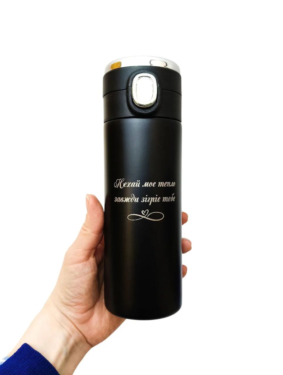 Подарунок наповнений змістом — ця термочашка з романтичним гравіюванням створена, щоб нагадувати про вас у кожному ковтку.